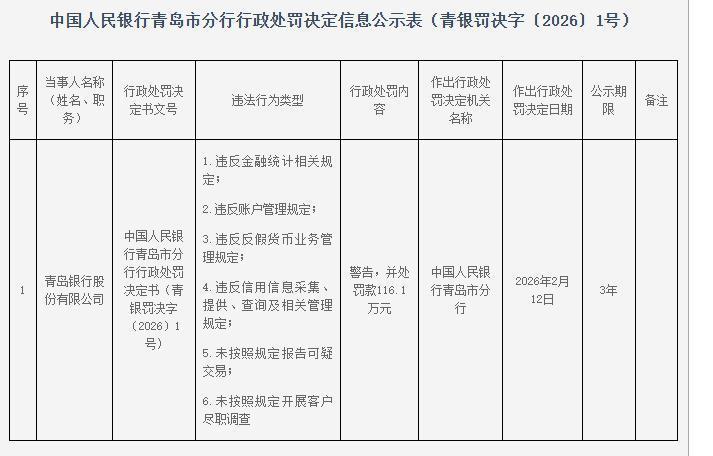 中国东谈主民银行青岛市分行对青岛银行股份有限公司警戒,并处罚金116.1万元。