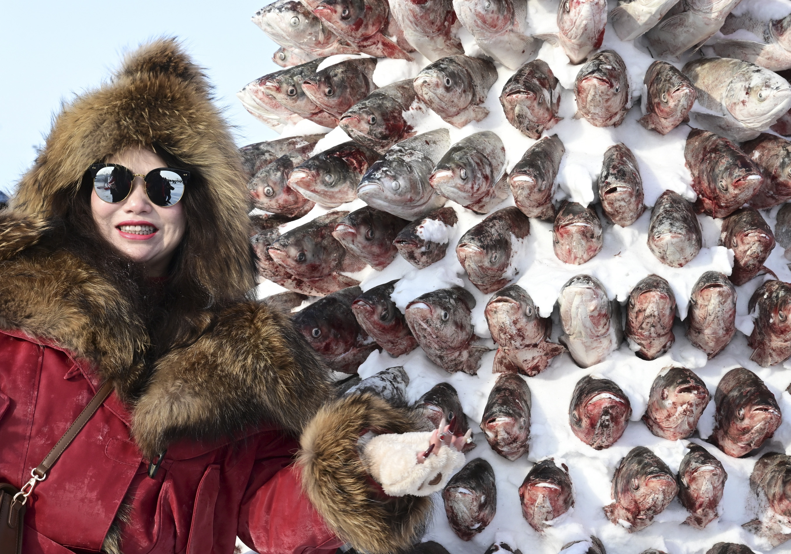 ↑1月10日,在黑龙江省肇东市大似海冬捕渔猎文化节上, 搭客在“冻鱼塔”前留影。新华社发(杨威摄)