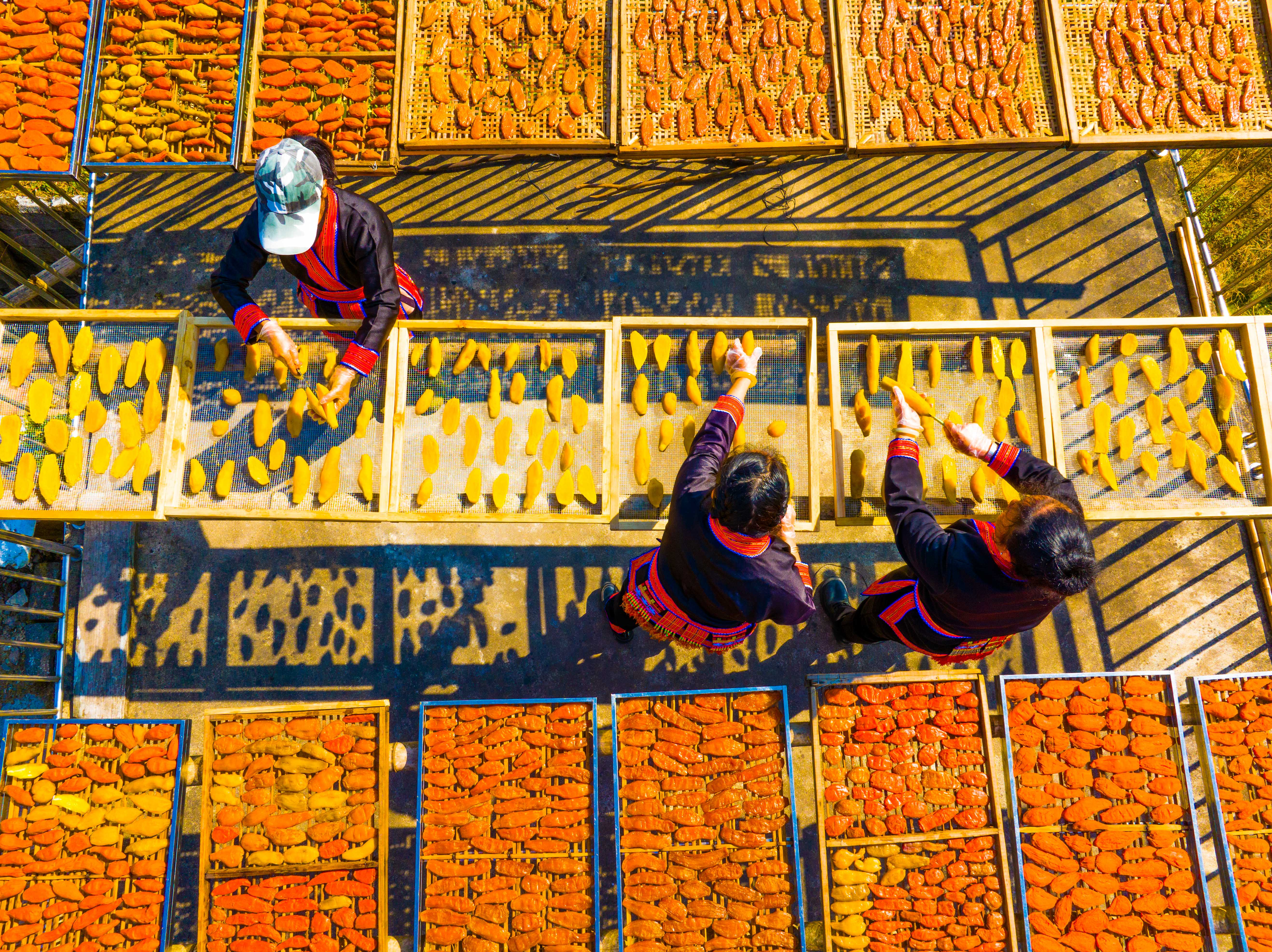 ↑1月12日,广西金秀瑶族自治县贤人乡巴勒村村民在院落里曝晒红薯干(无东说念主机像片)。新华社发(高如金摄)
