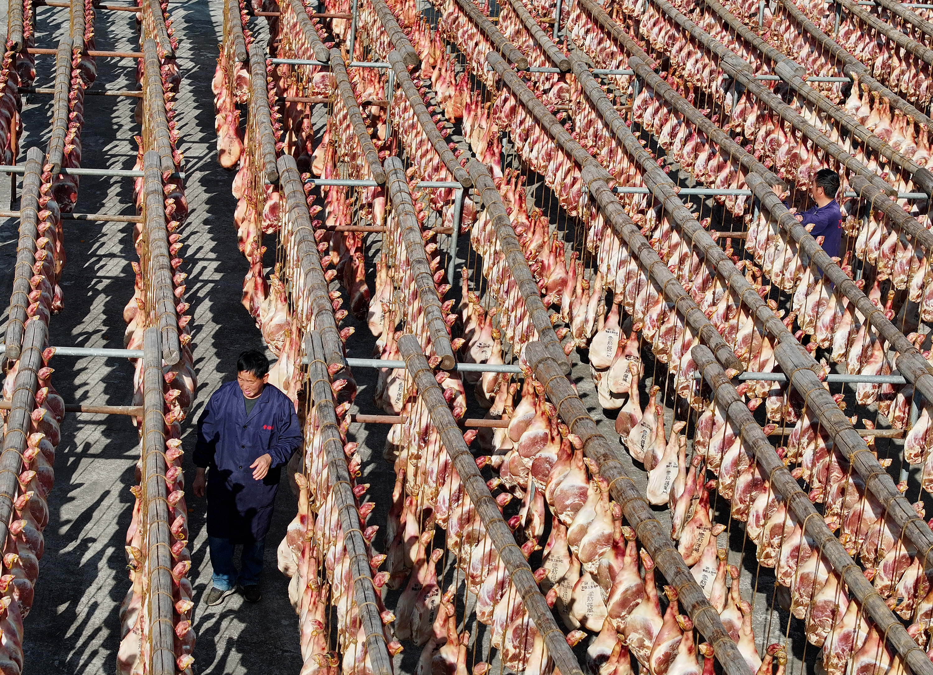 ↑1月13日,工东说念主在浙江省东阳市歌山镇曝晒火腿(无东说念主机像片)。新华社发(胡扬辉摄)