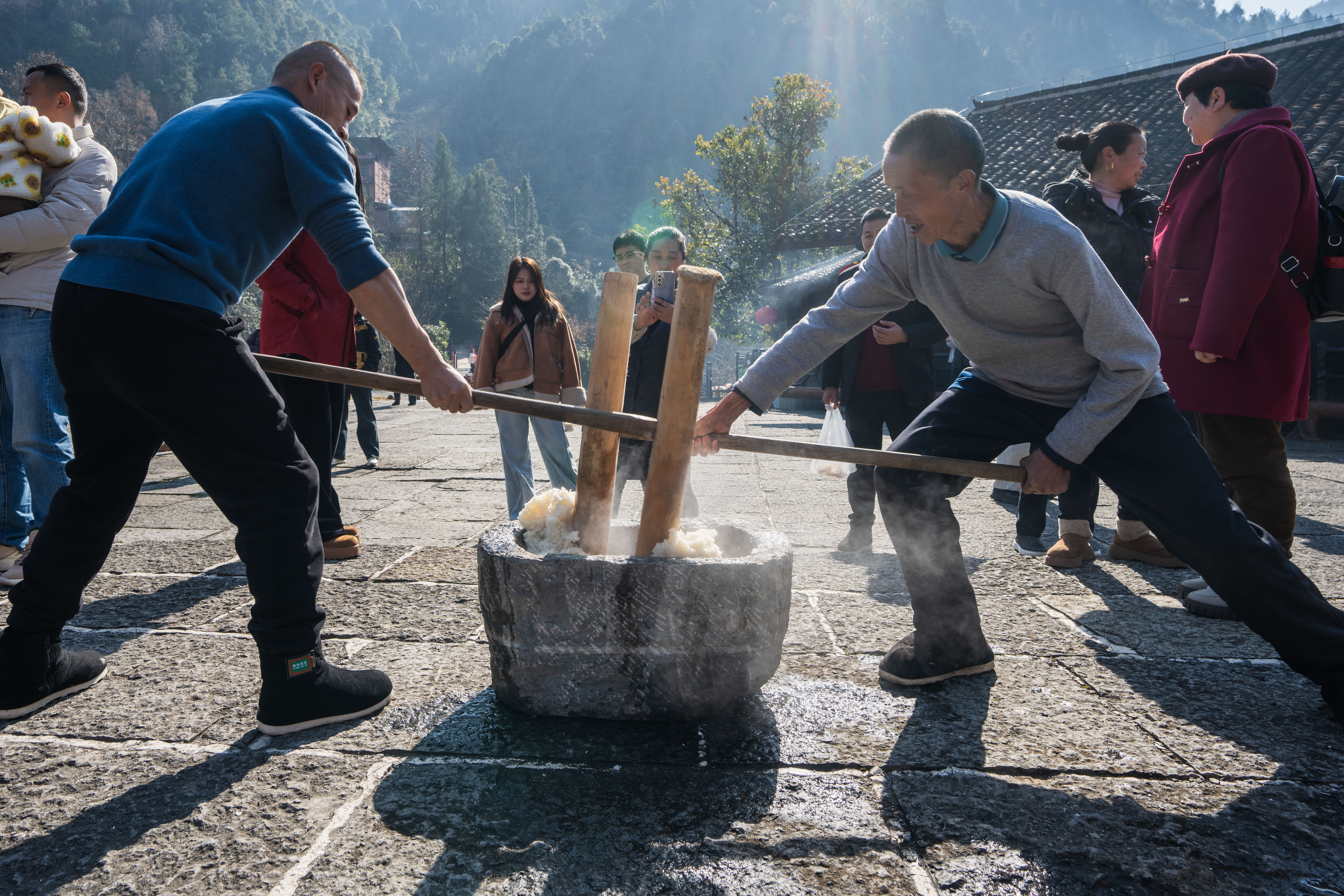 ↑1月10日,在湖北省宣恩县沙说念沟镇两河口村彭家寨,村民为搭客打糍粑。新华社发(文林摄)
