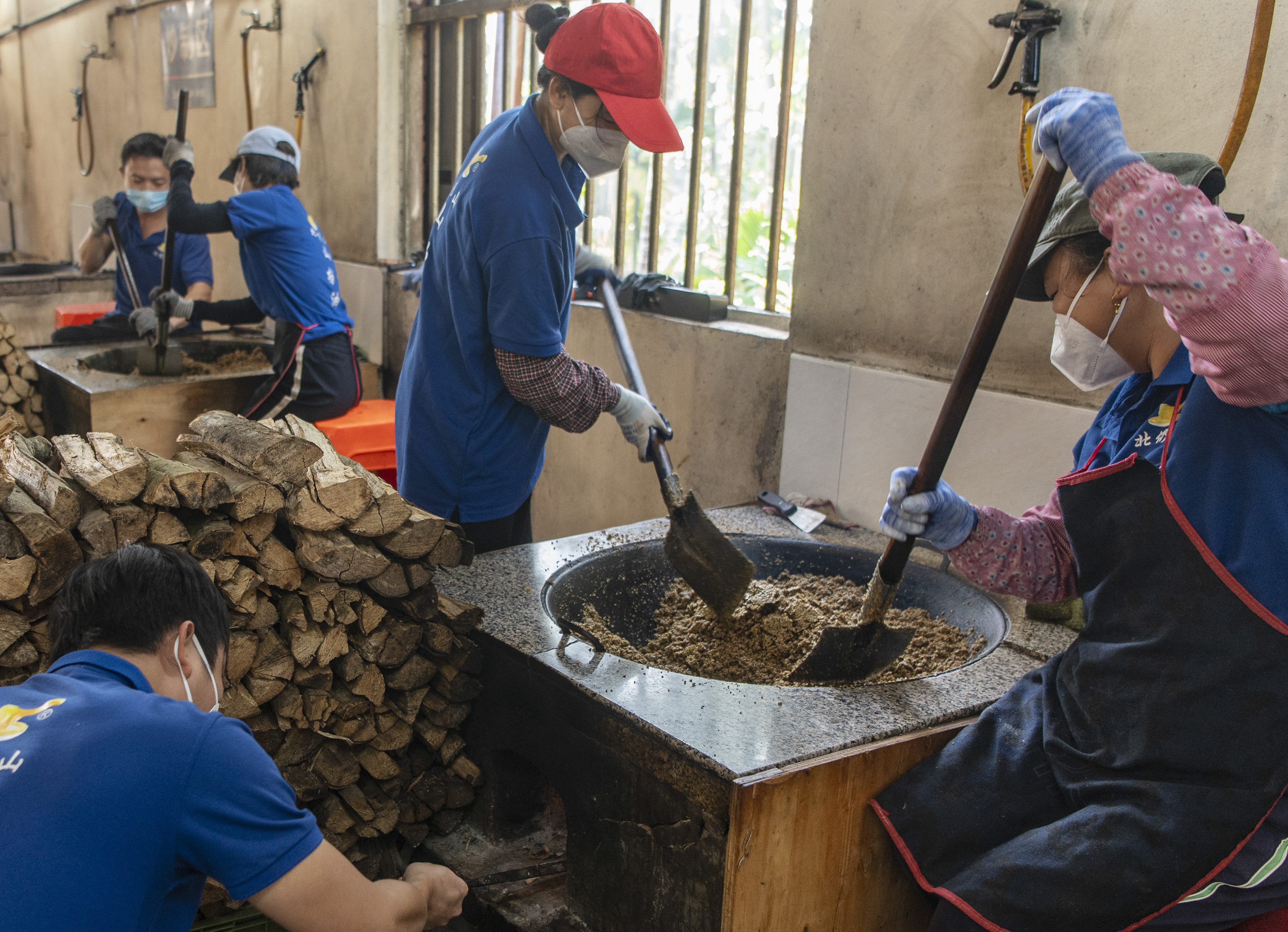 ↑1月11日,海南省琼海市嘉积镇温泉村一家作坊使命主说念主员在翻炒山柚籽粉。新华社发(蒙钟德摄)