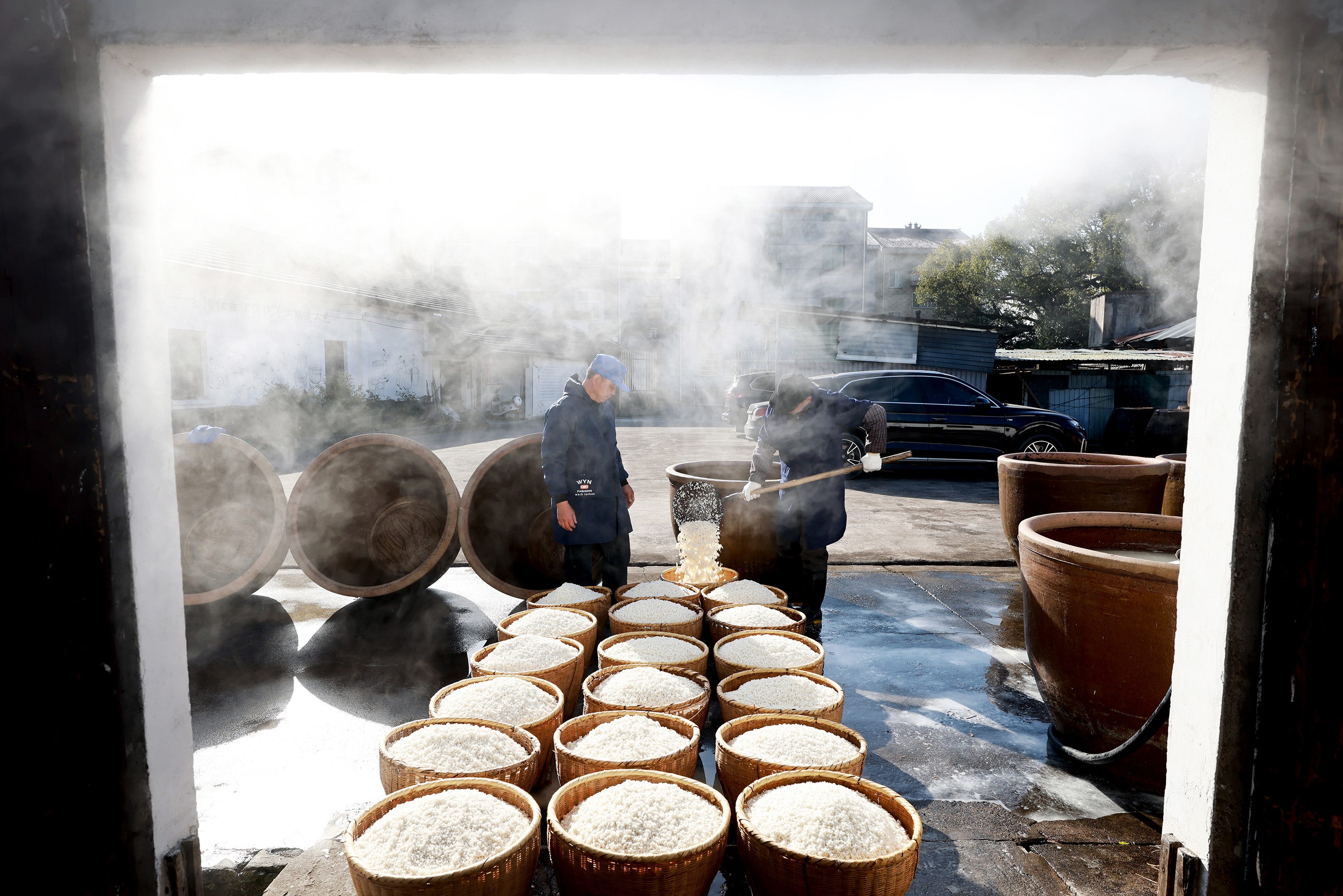 ↑1月11日,在浙江省东阳市马宅镇屠梁村钟山当然屯,酿酒师父在捞米。新华社发(胡扬辉摄)