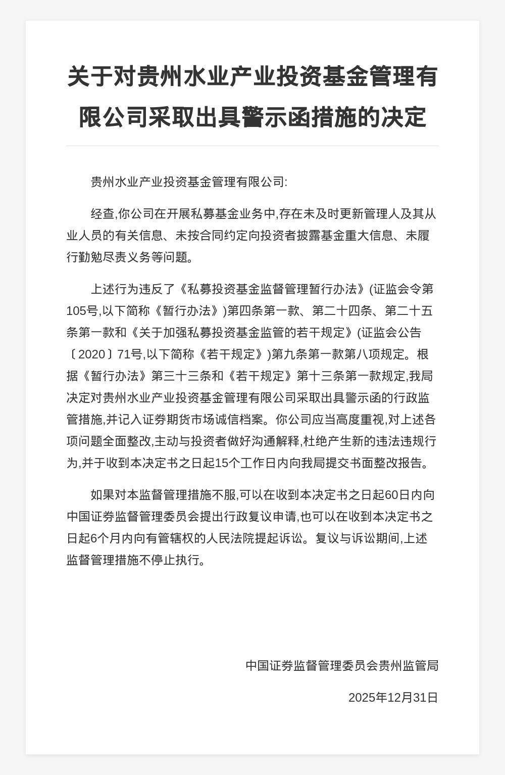 蓝鲸新闻2月16日讯,近日手机炒股杠杆开户 - 网上股票如何配资注册,中国证券监督处置委员会贵州监管局发布行政监管设施决定书,剑指贵州水业产业投资基金处置有限公司。